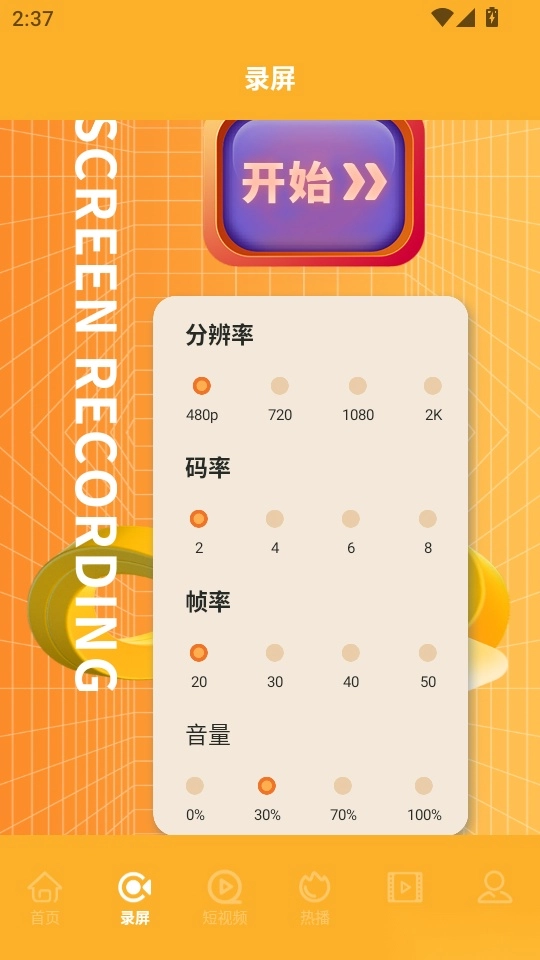 3.接着选择分辨率、码率、帧率和音量,之后点击“开始》”按钮进入到下一步操作