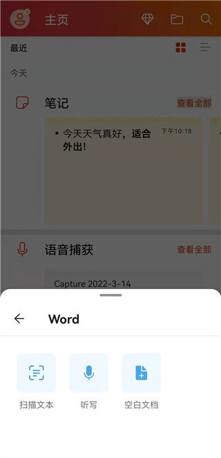 文档创建还提供扫描、听写和空白文档这三种途径。其中扫描文本就是大家常说的OCR识别功能,听写则是通过识别语音内容来生成对应的文字内容。