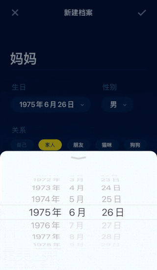 设置妈妈的生日,性别,预估年龄用默认,确定