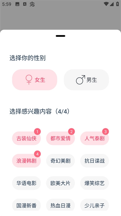 1、当我们打开软件之后,就会进入到软件的界面,在界面中我们需要选择自己喜欢的标签,也可以不选择,进入到软件主页;
