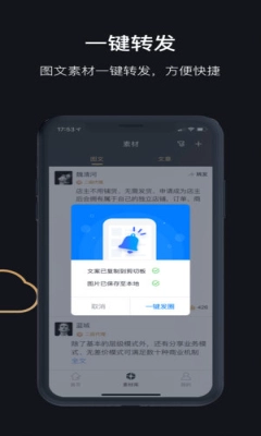 用户能够创建云端的素材相册。该相册的内容既可以是用户自行上传的图片与文案,也能通过将已关注的供应商(或好友)素材相册里的图文转发至自己的素材相册来获取。