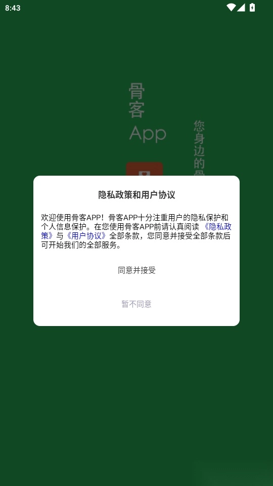 打开软件后,阅读“隐私政策和用户协议”,然后点击“同意并接受”按钮进入应用。
