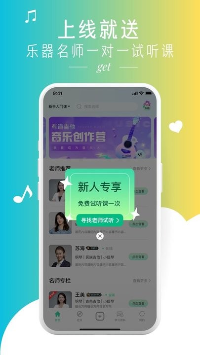 在线课程预约:支持用户随时随地预约真人乐器课程,个性化定制学习计划。