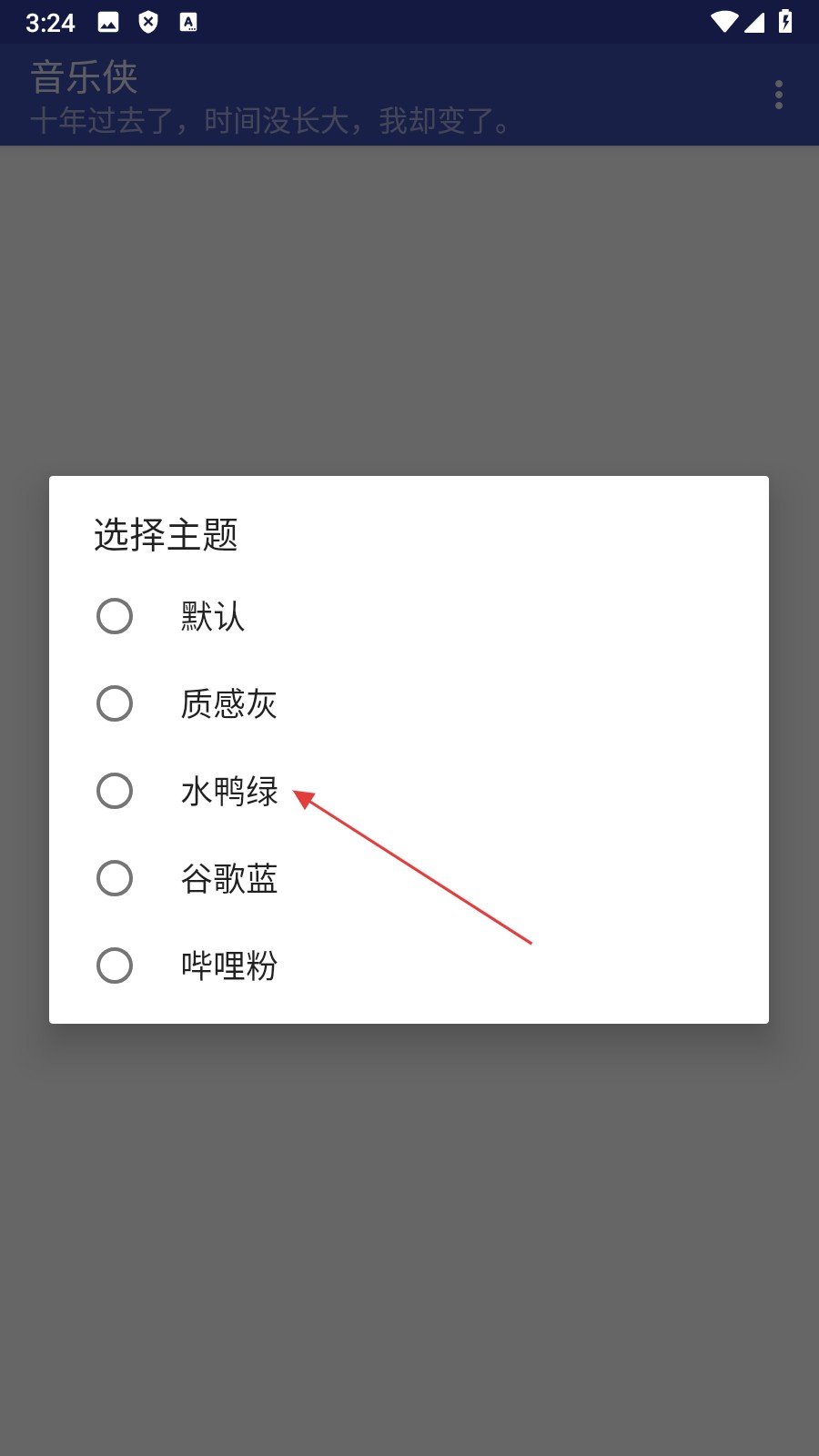 在主题选择弹窗中,选中【水鸭绿】这一选项,即可完成界面主题的更换操作。