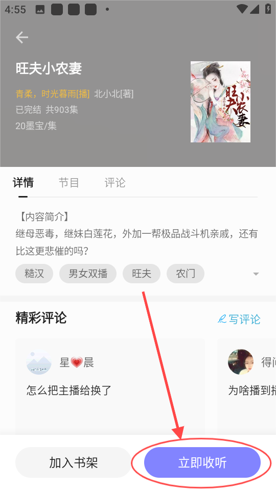 以《旺夫小农妻》这部小说为例,点击“立即收听”按钮就可以了。