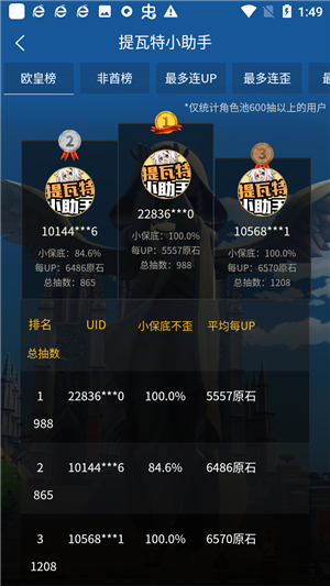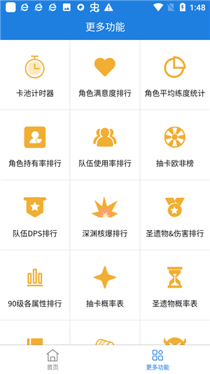 在这里,用户能够使用卡池计时器、角色满意度排行、角色平均练度统计、抽卡欧非榜等一系列功能。