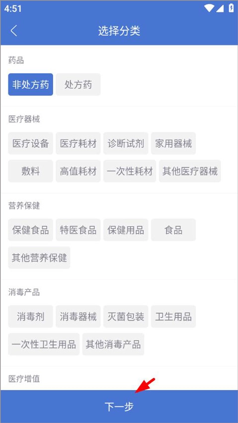 2、进入产品分类页面,用户根据产品的特性选择分类(例如药品-非处方药等),点击下一步;