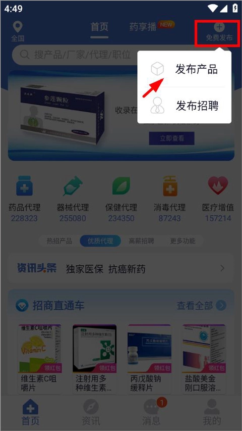 1、打开药脉通,登录进入主页,用户可在主页查看药品**、器械**、保健**、医疗增值、招商直通车等,点击右上角免费发布,选择发布产品;