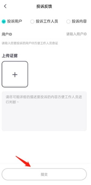 4、填写被投诉用户的ID,描述投诉内容,上传相关证据(如截图或录音),然后按“提交”即可。