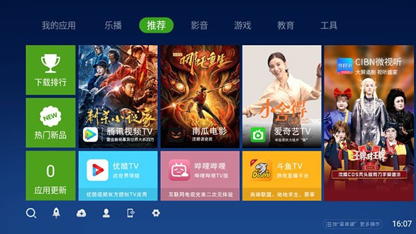 4、安装好奇珀市场后,打开它就能在里面找到我们需要的各类电视软件,像电视直播、视频点播、游戏类软件等,比如优酷、腾讯视频、芒果TV这些应用。