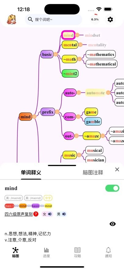 以思维导图的模式进行英语单词学习,帮助用户更加审核的记忆;