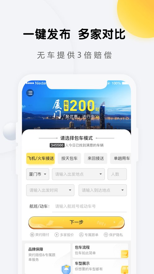 【包车快速询价】:提交您的用车需求,即刻就能收到多家车队的报价。