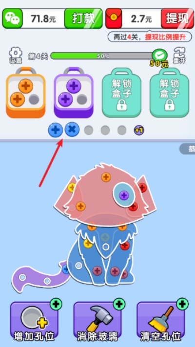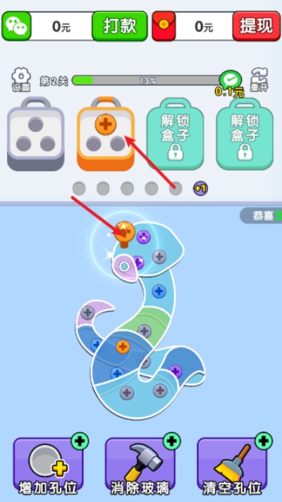 玩家在游戏里化身消除能手,点击螺丝就能把它放进对应颜色的盒子里。
