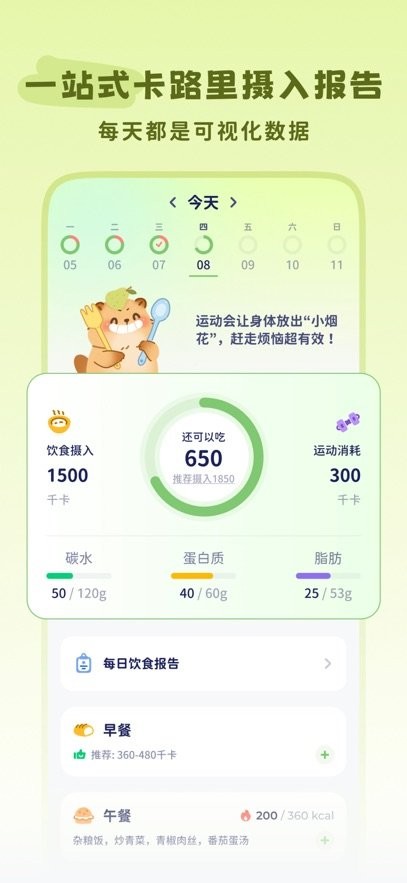 对TA说“早餐吃了一个包子,喝了一杯豆浆”,TA立刻恢复识别食物热量以及营养成分并完成记录。吃了多少,还能吃多少,一目了然!