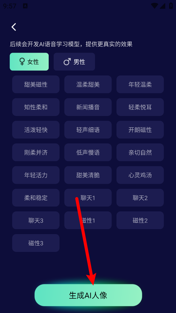 6、向下滑动找到“好声音”选项并选中后,点击页面底部的“生成AI头像”按钮就可以了。