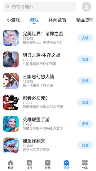 3. 一款手机应用工具,界面设计十分简洁,各项功能清晰明了。平台上有丰富多样的应用可供探索发现,还会每日更新内容并推送手机游戏相关通知。主界面划分了家庭、流行、游戏、新产品四个类别板块,所有展示的应用均为真实可靠的。