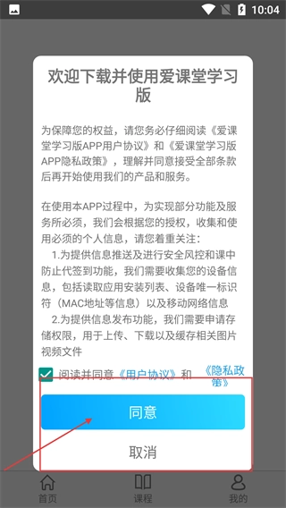 进入【爱课堂学习版】后,需先阅读并勾选同意【用户协议】和【隐私政策】,点击【同意】按钮以继续使用产品。