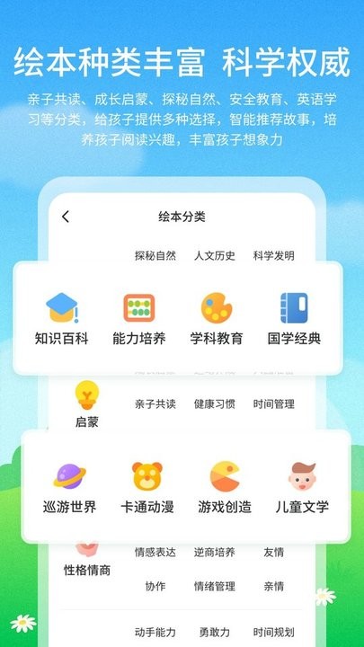 是读绘本听故事,支持按不同主题和领域分类浏览绘本,方便家长和孩子查找,绘本获取更容易。丰富且精选的绘本资源,保障孩子接触到高质量阅读内容。