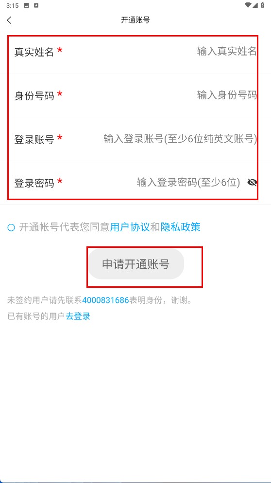 在账号开通页面,依次填写真实姓名、身份证号码、登录账号与登录密码,勾选相关协议后,点击【申请开通账号】功能按钮即可完成注册流程。