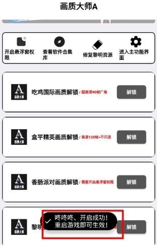进入画质大师A软件后,用户可选择需要优化画质的游戏,选好后点击旁边的“解锁”按钮即可。