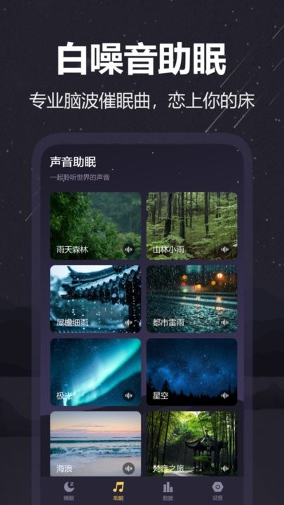 为您提供海量白噪音、催眠曲、冥想音乐、助眠脑波与轻音乐,打造专业舒适的入睡氛围