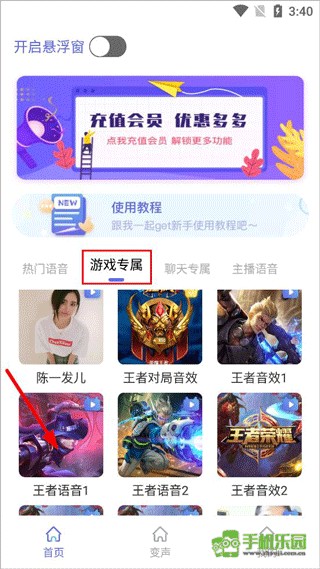 ,有首页、变声和我的版块,点击首页游戏专属,找到需要的语音包打开;