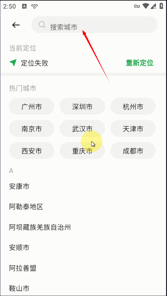 3、在新的页面中点击搜索框输入需要切换的城市即可