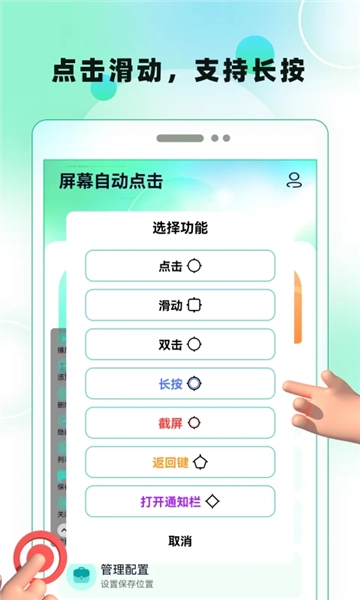 滑动手势组合操作,自由添加点击位置,点击速度、点击次数、方便快捷,便捷操作。