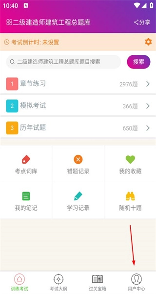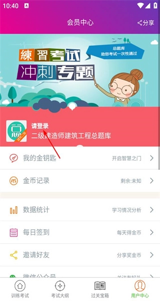 打开软件后,进入训练考试页面,找到用户中心选项,点击进入会员中心。