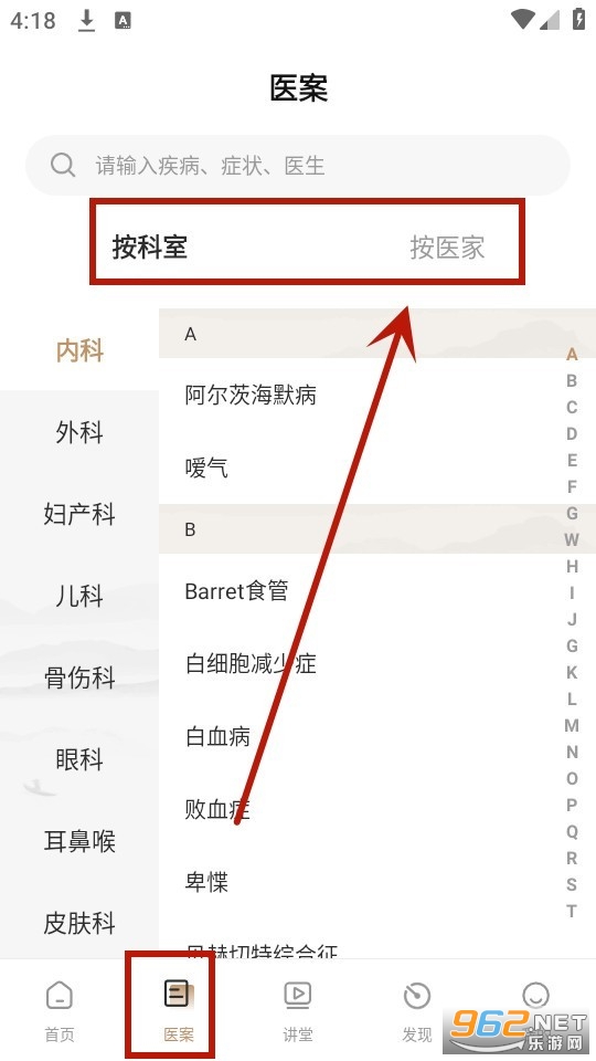 先安装中医医案应用并将其打开,在应用内可依据科室或医家这两个维度进行筛选,直接点击对应的选项就能查询到相关的具体信息。