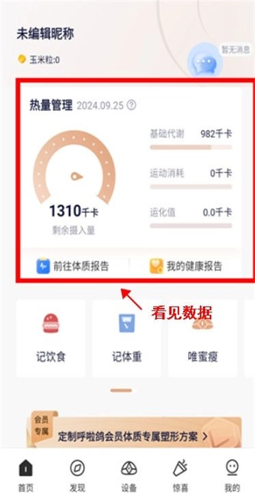 2、用户在进入主页之后可以看见饮食、体重、唯蜜瘦数据监测。