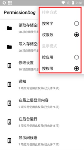 1、先把权限狗安装好,打开应用后点击右上角的三条横线图标,接着选择应用排序或者权限排序即可。