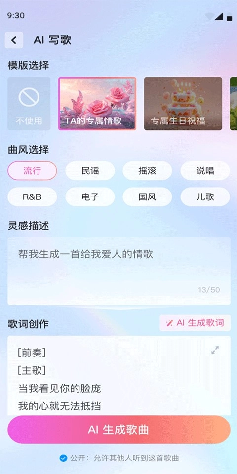 3、AI创作歌曲:只需输入一句话,AI就能一键为你生成专属音乐;