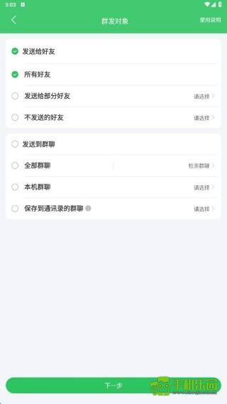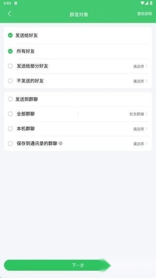 3、进入群发功能开启板块,对群发对象进行自定义设置后,点击下一步操作即可;