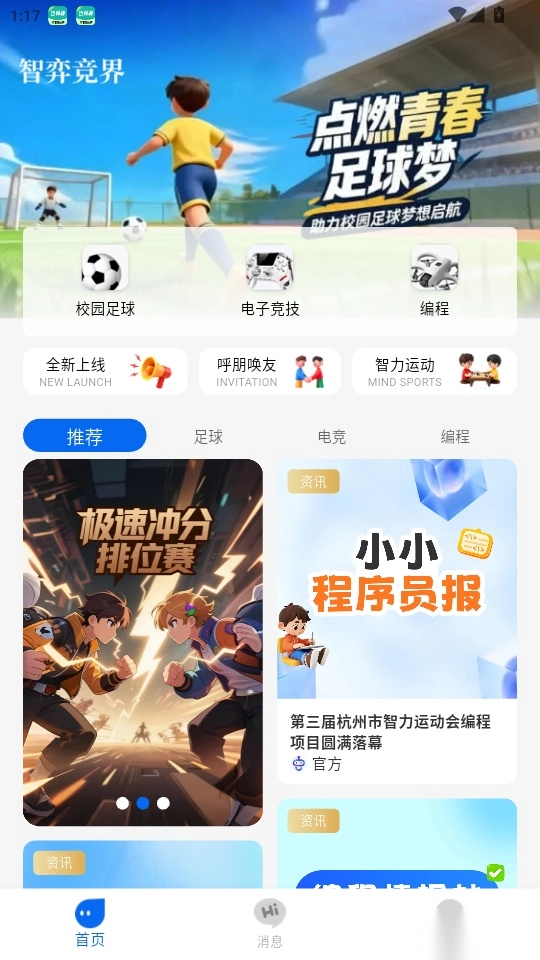 智弈竞界最新版是一打造数字化智力运动服务的软件,软件中将足球、电竞、编程等各种类型的智力运动资讯实时推送,用户可以随时关注各种智力运动的各种赛事动态,便于用户随时报名参加自己感兴趣的各种智力运动赛事,将各种智力运动的赛事资讯一手掌握,了解更多更精彩的智力运动赛事资讯内容,其中还对智力运动做了详细的科普介绍,让用户可以快速了解智力运动,平台会实时更新推送更多智力运动相关的资讯信息,让用户可以随时掌握到最新的智力运动资讯内容,有需要的用户就快来智弈竞界免费版软件进行使用吧!