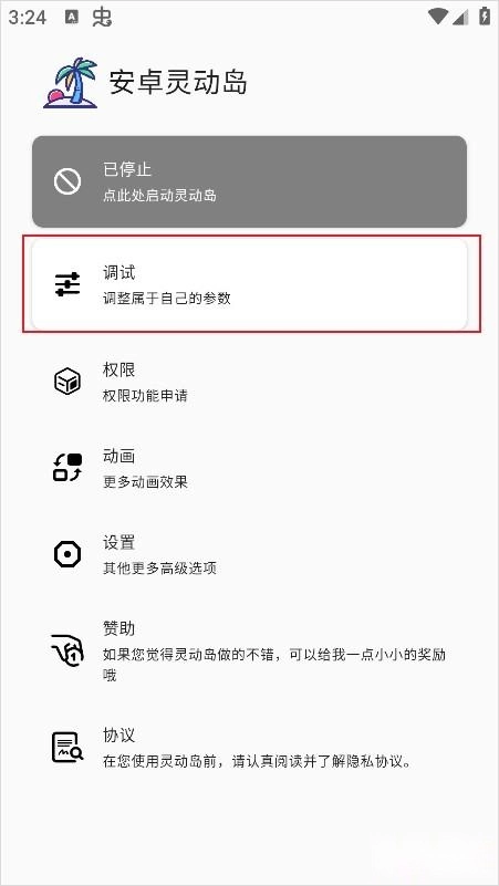 1、安装完成后打开灵动岛设置工具,进入软件界面后点击顶部的调试功能选项。