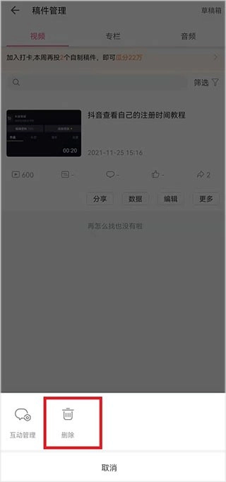 5、屏幕下方会弹出小窗口,点击【删除】按钮即可删除作品。