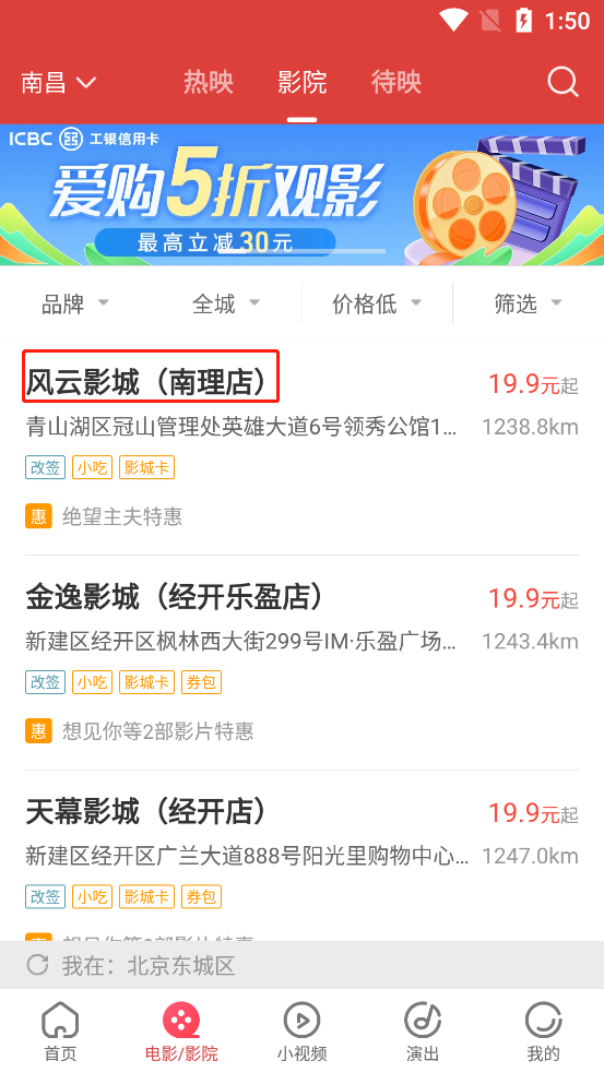 1、启动软件后,首页设有电影/影院、演出、密室、放映厅、剧集等功能板块,我们点击“电影/影院”选项;
