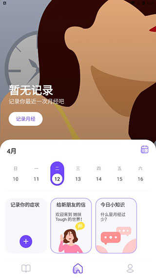 首页:主要用于记录月经周期,并且具备症状记录的功能。新用户可以收到欢迎信,另外每日更新的小知识板块会解答像“什么是月经过少”这类问题。