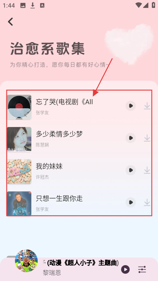 2、在治愈系歌集页面,能找到《忘了哭》这类歌曲,挑选你想播放的目标歌曲,点击进入它的播放详情页。