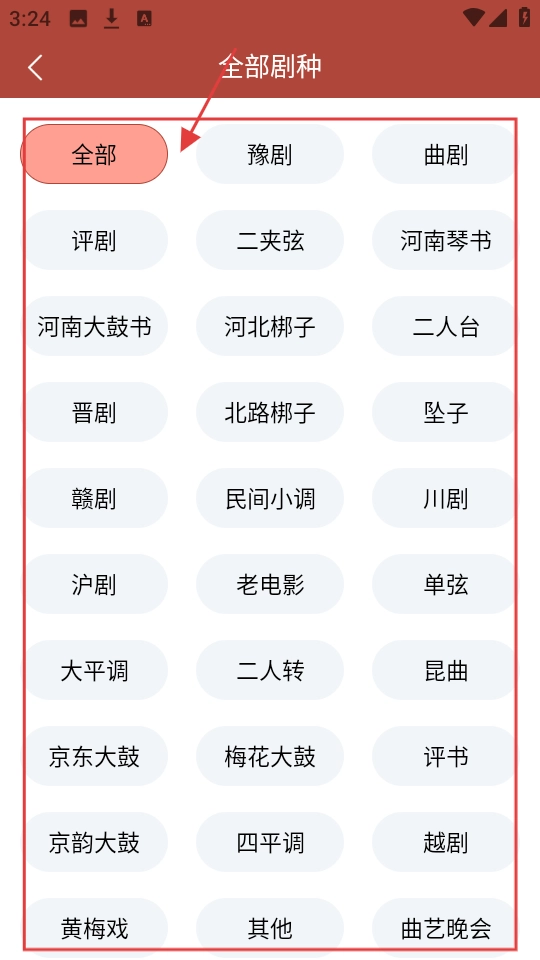 1、进入首页,有【全部剧种】【戏曲名家】等功能,想找各类戏曲,点【全部剧种】,查看所有剧种分类。