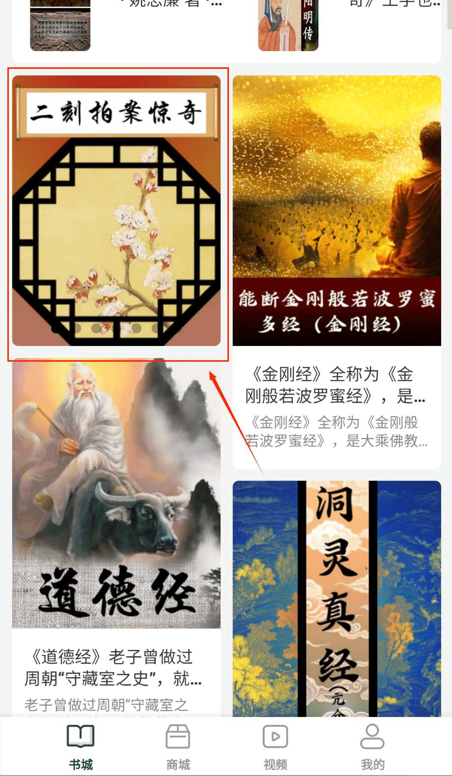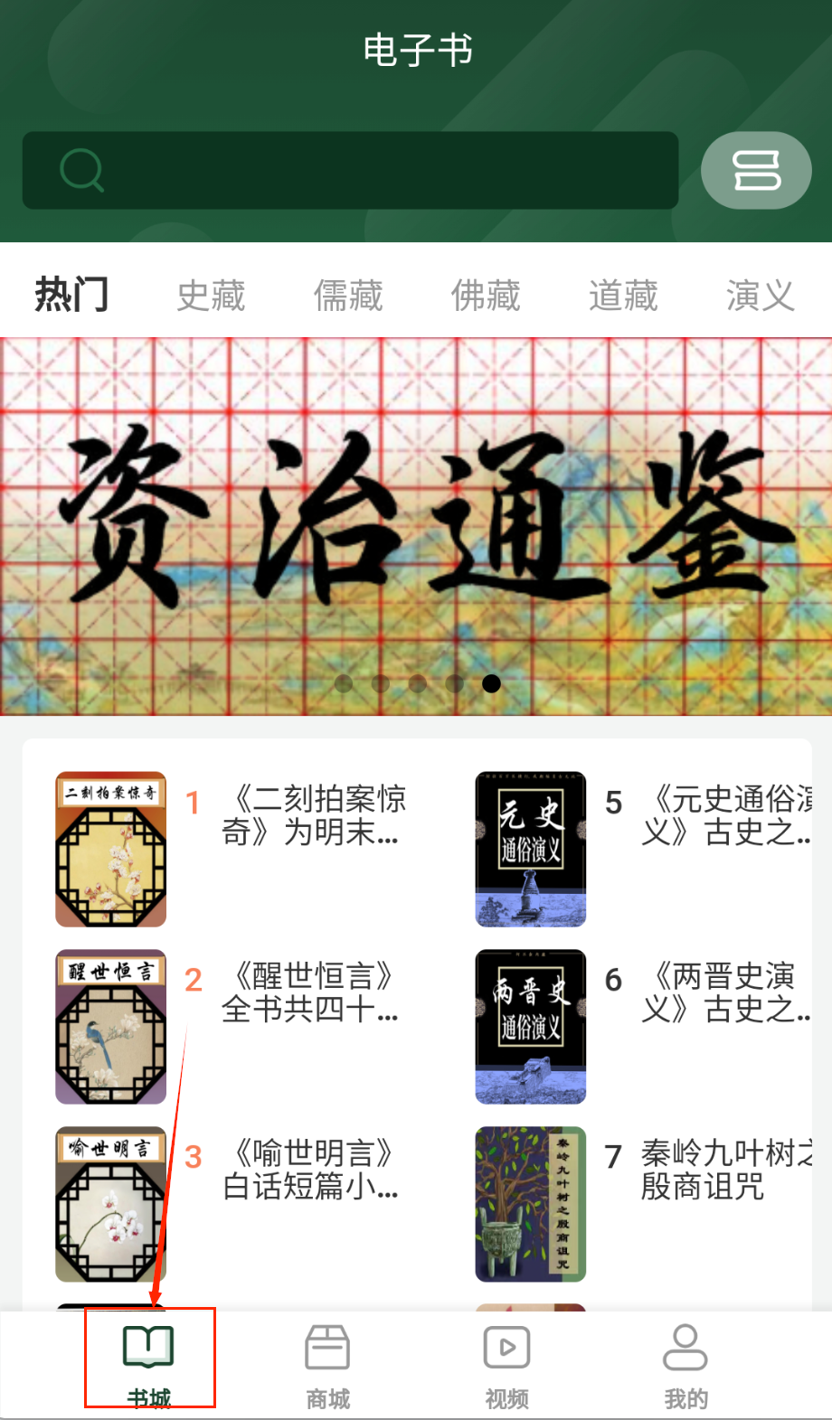 安装完成后,通过手机号完成注册与登录操作,进入书城页面后,既能浏览首页推荐的热门书籍,也可依据经史子集这类传统分类方法进行查找。