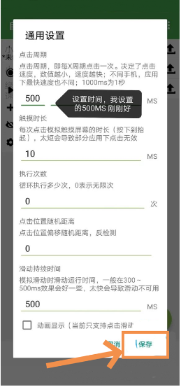 9、选择第一个点击周期设置每次点击中间间隔时间,这个时间单位是毫秒,一秒等于1000毫秒,这里需要设置成500毫秒,就是半秒钟,时间太长太短都不行,500我设置时间对我的正好,每个人手机灵敏度不一样,你们也可以根据自己手机的反应速度来设置时间,多试几次找到适合自己的就行,点击位置随机偏移建议设置20防检测,设置完成后点击右下角保存。