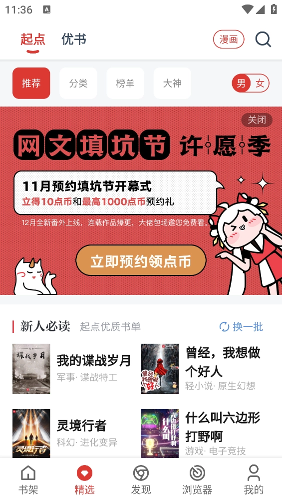 点击“精选”频道,能快速查看编辑推荐、最新更新、热门连载等优质内容。