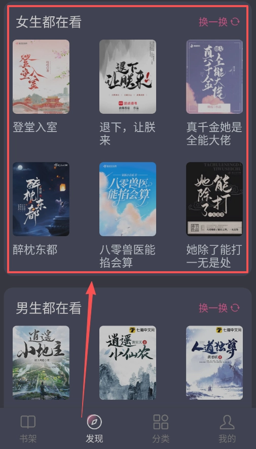 你可以通过首页的“猜你喜欢”和“男生女生都在看”板块选书,也能按照分类精准查找,遇到合心意的,直接收藏或阅读即可。