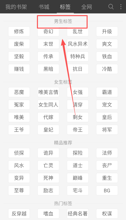 1、找书优先使用“标签”页,通过男生、女生、精品等标签快速筛选,比逐级浏览分类更高效。