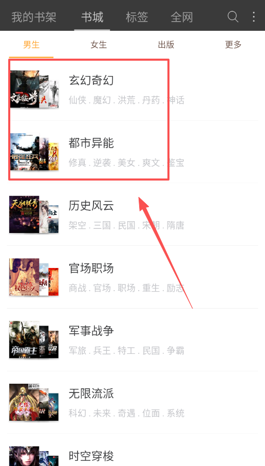 2、书城页面适合泛浏览,可按玄幻、都市、历史等大类了解作品分布,并结合细分标签如“三国”“系统”进一步聚焦。