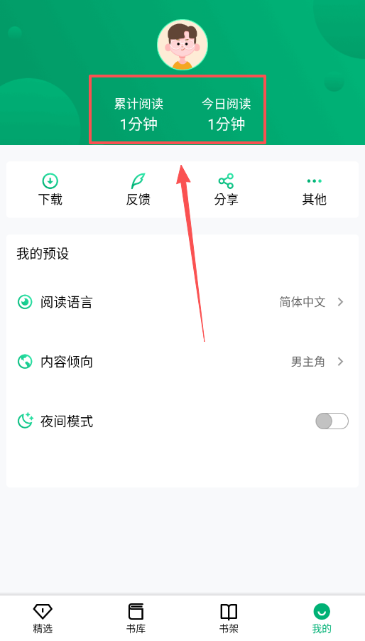 3、点击底部的“我的”,既能查看阅读时长记录,也能对“阅读语言”和“内容倾向”进行设置。