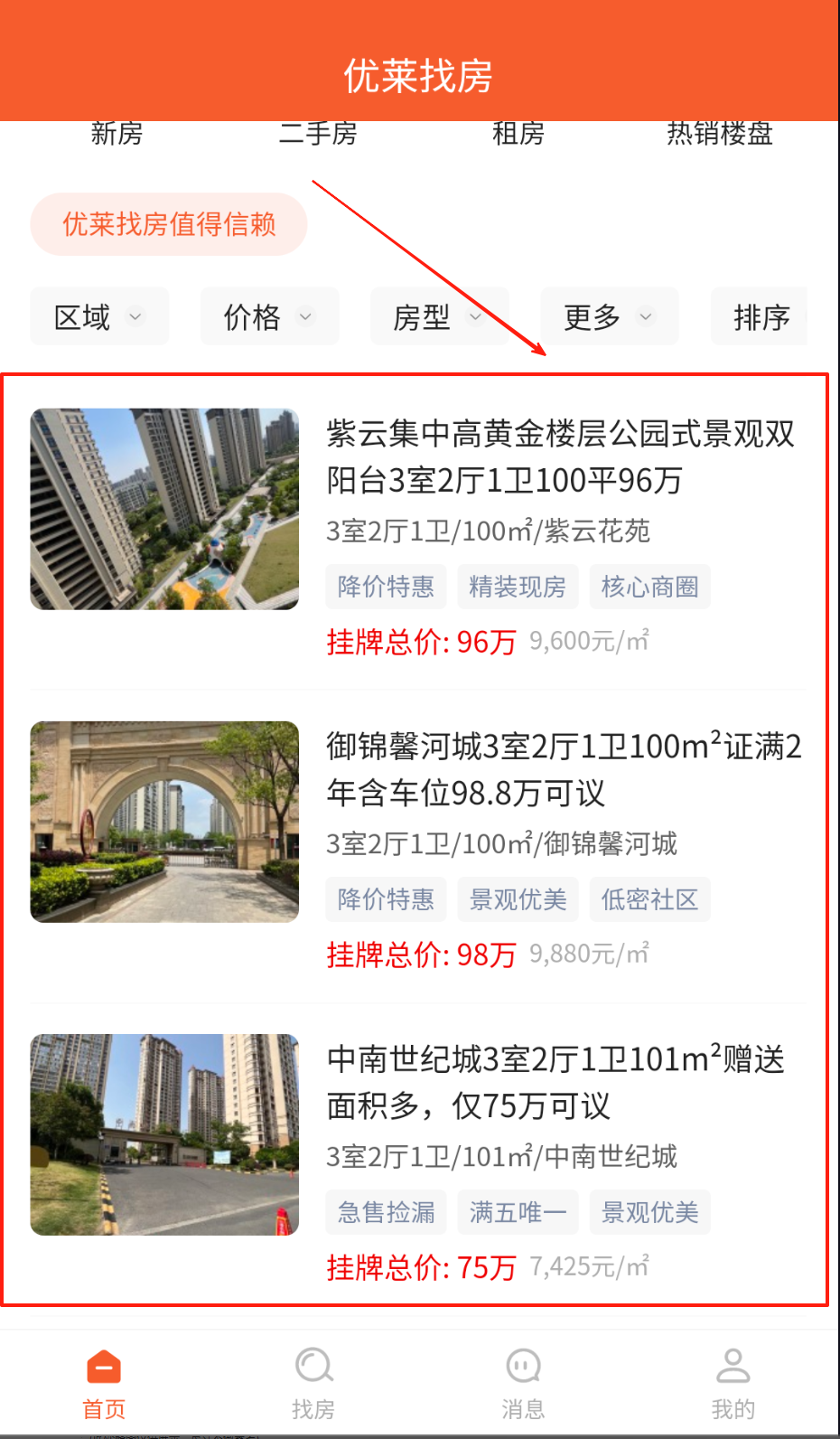 启动后会自动定位当前所在城市,还能智能推荐该区域内的热门在售房源,同时支持依据户型面积和价格区间来筛选心仪的房产。