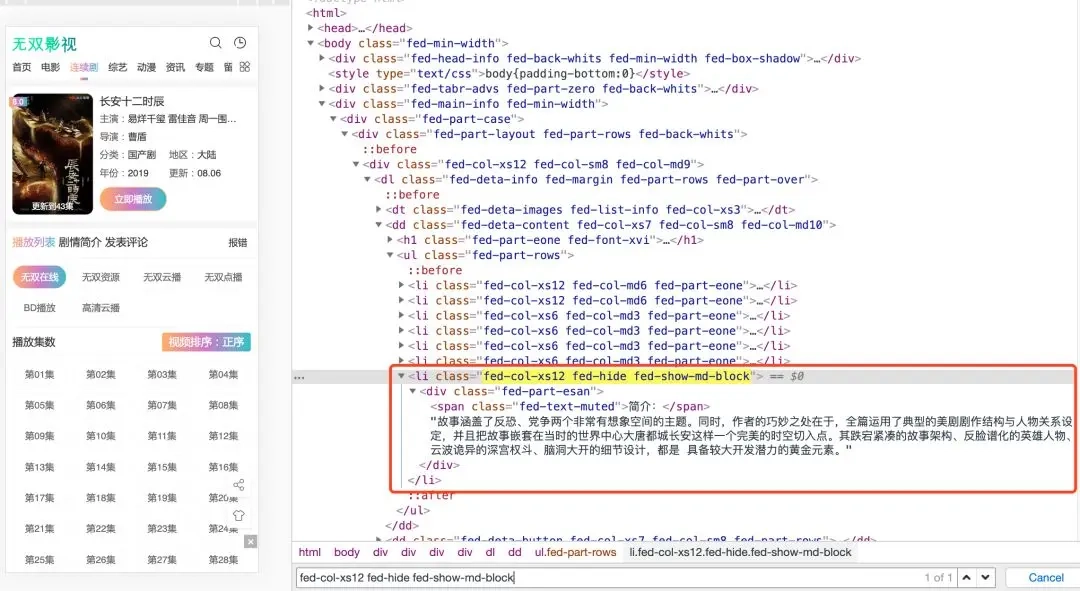 剧集详情页简介:class.fed-col-xs12 fed-hide fed-show-md-block.0@text